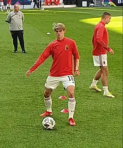 On 16 August 2023, Atalanta formally confirmed the signing of De Ketelaere from AC Milan on a loan move with an option to buy.[10] On 20 August 2023, De Ketelaere came off the bench during Atalanta's Serie A match against Sassuolo, striking the crossbar before sealing his debut Serie A goal with a precise header.[11] The match ended 2–0 in Atalanta's favour.[12] On 21 September, De Ketelaere marked his presence by netting his first goal in a UEFA Europa League group stage match against Raków Częstochowa, contributing to Atalanta's 2–0 victory.[13][14] De Ketelaere scored 14 goals and provided 11 assists in all competitions during his first season at Atalanta; the club made his move permanent on 15 June 2024.[15] Later that year, on 26 November, he scored a brace and provided a hat-trick of assists in a 6–1 away victory over Young Boys in the Champions League.[16]