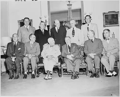 The members of Truman's cabinet in August, 1949, from left to right: Alben W. Barkley, Dean G. Acheson, Truman, John W. Snyder, Louis A. Johnson, Tom C. Clark, Jesse M. Donaldson, Julius A. Krug, Brannan, Charles W. Sawyer and Maurice J. Tobin
