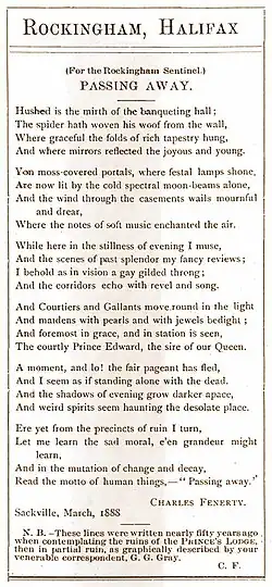 - ^ Fenerty won the 1854 Nova Scotia Industrial Exhibition Award for best poem of a Canadian topic.)