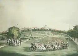 In 1823 he contributed to the July 4th festivities in Hingham, Massachusetts. "The dawn of this interesting day was, as usual, ushered in by the ringing of bells. ... At an early hour a numerous collection of beauty and fashion, alive to the feelings of which the occasion inspired, assembled to witness the presentation to the Hingham Rifle Company, of an elegant stand of colours, painted by Mr. Charles Hubbard, of Boston, in a style which does great credit to the talents of the artist."[11]