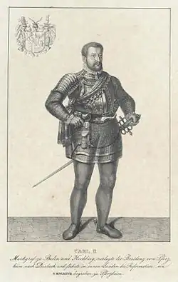 Charles II, Margrave of Baden-Durlach (born 24 July 1529 in Pforzheim; died 23 March 1577 in Durlach), nicknamed Charles with the bag, governed the Margravate of Baden-Durlach from 1552 to 1577. On 1 June 1556 Charles issued a new Church Order, which made Lutheranism the official religion in Baden-Durlach.