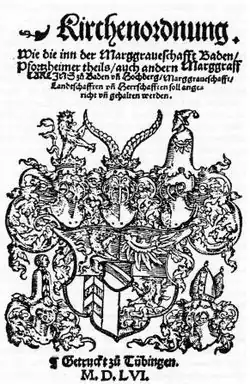 The preparation of the Reformation and the drafting of church order was entrusted to a Commission chaired by Martin Achtsynit, the Chancellor of the Margraviate of Baden (Pforzheimer part). Members of the Commission were the theologian Jacob Andreae from Tübingen, the court preacher Michael Diller from Heidelberg and the Saxon theologians Max Morlin and John Stossel.[3] In addition to the theologians, the Councillors Johann Georg and Renz Sechele also belonged to the Commission.[4] Achtsynit was also the first director of the Council of Churches; Charles himself was bishop of the Evangelical Church and so became successor to the bishops of Strasbourg, Speyer and Constance, who had been competent for different parts of his territory. The "inner conflict within the Protestant confession" also affected the work of the Commission.[4] In the end, the commission chose, for political reasons, to largely copy the church order of Württemberg, which had been drafted by Johannes Brenz in 1553, with final editing by Jacob Heerbrand. Württemberg also allowed Jacob Heerbrand to participate in the first church visitation in Baden-Durlach, which was conducted in the autumn of 1556. Charles appointed the theologians Simon Sulzer from Basel as General Superintendent for Upper Baden.