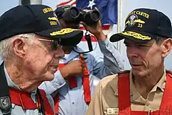 Former President Jimmy Carter speaks with Commander, Submarine Force, U.S. Atlantic Fleet, Vice Adm. Charles Munns, as they ride out to sea on the bridge aboard the Seawolf-class submarine USS Jimmy Carter.