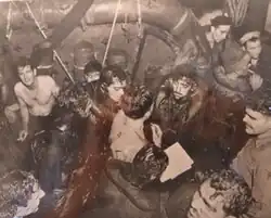 Further explosions by two more torpedoes that hit under the second stack, port side (near frame 82 and about frame 85) less than two minutes later at about 0205 caused catastrophic and terminal damage. Men were thrown about twice with each following explosion, and the force was greater the higher up in the ship's structure. This is the time that Carpenter was injured. The forward movement of the ship, along with the massive structural frame damage, caused the ship to twist and jackknife around the damaged area. The ship's momentum quickly fell off and began to flood. The center part was twisted to 45 degrees, port sinking first. It dragged the rear of the ship down until the stern was vertical. The men quickly realized that the damage was fatal and began to abandon ship. About 22 minutes after the ship was first hit, the ship sank at about 02:25. In the meantime, Carpenter, who had been wounded in the legs, and others of the crew abandoned ship by going over the side after cutting free all the surviving lift rafts into the ocean. Even though the forward momentum of the ship dropped off rapidly, the survivors were scattered over several hundred yards at night amidst a raging naval battle. Later currents would separate them even more.[33][34]