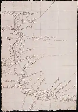 Two more near-disasters on May 17 led to the naming of additional features. William Clark was nearly bitten by a rattlesnake while exploring a creek on the northern side of the river. This creek was named Rattlesnake Creek (although today it is called Timber Creek). The party camped near a creek on the south side of the river that evening. Clark saw a fortified Native American lodge a short distance up the creek, believing it to be an Atsina (Gros Ventre) site. Late that night, a cottonwood tree sheltering the camp caught fire from sparks rising from the expedition campfire. The men were barely able to get out of their tent and pull it out of the way before the tree came crashing down on the site. Lewis named this Burnt Lodge Creek (although today it is known as Seven Blackfoot Creek).[34] On May 20, the expedition passed the Musselshell River.[35] On May 22, the party passed another creek, which they decided to name Sacajawea Creek.[36] (Later renamed Crooked Creek, the U.S. government formally changed the name back to Sacagawea Creek in 1979.)[37] The Corps of Discovery left the CMR NWF on May 24 or 25, after spending a week passing through and exploring the area.[38]