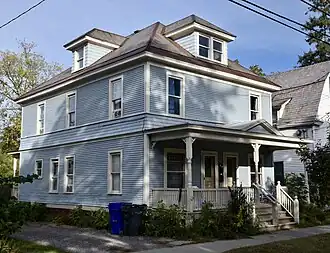 The Charles R. Palmer House stands in a mixed residential area on the eastern side of Burlington's Old North End neighborhood, on the west side of North Willard Street between Russell and Pomeroy Streets. It is a two-story wood-frame structure, with a hip roof pierced by hip-roof dormers. Its exterior exhibits a variety of stylistic architectural elements, including bands of wooden shingles between the first and second floor, which are otherwise finished in wooden clapboards. It has a single-story porch extending across the front, with turned posts and decorative brackets. It is covered by a flat roof with a shallow gable at the center above the stairs. The interior is divided into mirror-image residential units, with L-shaped staircases that retain original balustrades.[2]
