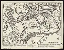 Charles entered service in the French army in 1676[3] as a musketeer, in the second company of the Mousquetaires du Roi (mousquetaires noirs[9]), where he eventually ended up as sous-brigadier.[10] He was wounded at the Battle of Blenheim.[d][3] He commanded the artillery of the French army as lieutenant-général de l'artillerie in 1707 under Villars. The next year he took part in the Rhine campaign of the Elector of Bavaria.[2] In 1709 he fought at the Battle of Malplaquet. There he faced the Dutch attack of the Prince of Orange on the French right. When the Dutch entered the French entrenchments despite suffering heavy casualties de Quincy was proud not to see any soldiers of his regiment flee; Except one called Le Rouge. He was very lucky, because ... I ran after him to pierce him with my sword, [but] I fell, fortunately for him. This gave him time to rejoin his company. Afterwards, he swore to me that his company had run out of powder and that he had gone to get it. But his subterfuge was implausible, because we had only ordered the tambourineers to go and get it if the soldiers ran out.[11] After the Peace of Utrecht he was appointed governor of Auvergne. He was a chevalier de l'ordre militaire de Saint-Louis.[6][12]