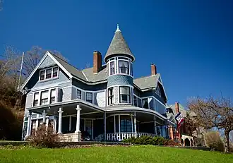 The Charles T. Hancock House, also known as the Hancock-Gross House, is a historic building located in Dubuque, Iowa, United States. Hancock owned a large wholesale grocery firm. He hired local architect Frank D. Hyde to design this three-story frame Queen Anne. Completed in 1890, the house is situated on the brow of a 64-foot (20 m) bluff. It has views of the city below, as well as the hills of Wisconsin and Illinois across the Mississippi River. While restrained when compared with other houses in this style, it does feature an irregular plan, a wraparound porch, multiple roof lines, narrow bargeboards in the gables, and a corner tower with a conical roof.[2] The house was individually listed on the National Register of Historic Places in 1986,[1] and it was included as a contributing property in the West Eleventh Street Historic District in 2004.[3]