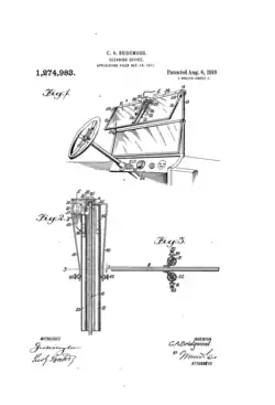 In October 1917, Charlotte received a patent for the first automatic windshield cleaner.[6] The patent protected the mechanism of rollers powered by the car's engine or a separate motor to clean the windshield. However, she never brought her design into full production, so the patent expired in 1920.[7] Since US patent law no longer protected her product’s propriety, it was only a matter of time until large car manufacturers picked up her design. Cadillac was the first company to adopt the design two years later. Charlotte Bridgwood’s invention was left without much recognition.[8]