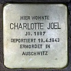In 2013, a Stolperstein was laid in Berlin at Klopstockstraße 19 for Charlotte Joel.