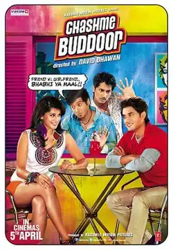 Chashme Baddoor is a 2013 Indian Hindi-language slapstick comedy film directed by David Dhawan and written by Sajid and Farhad Samji. An official remake of the 1981 film Chashme Buddoor, it was produced by Viacom 18 Motion Pictures[2] and stars Ali Zafar and Taapsee Pannu (in her Hindi film debut) with Divyenndu and Siddharth in lead roles.[3] The film was released on 5 April 2013.