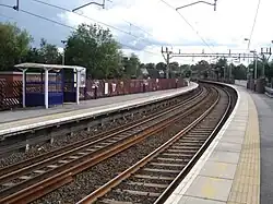 ![]() Platforms 1 and 2, with the footbridge, constructed in 2011, clearly visible in the background. | |||||