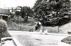 The original Cheadle Hulme railway station on the Crewe line, about 0.3 miles (0.5 km) south-west of the current structure, was known simply as "Cheadle". It was in use from May 1842, following the opening of the viaduct. The station building, opposite the Hesketh Tavern public house, is now a private residence. It included a structure from which tickets were sold, and in the window of which a candle was lit to act as a signal during the hours of darkness.[4] This structure, however, no longer exists.[5]