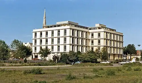 A Waitrose supermarket now stands on the site of St. James station. A plaque has been affixed to the entrance of the store by Cheltenham Civic Society to commemorate the now-demolished terminus.[18] Prior to the construction of the superstore, which opened in 2002,[19] the trackbed was used as a cyclepath linking the town with Cheltenham Leisure Centre, and so when planning permission for the redevelopment of the station site was granted, a condition was imposed that the developer construct a new pedestrian bridge to ensure continued access to the remaining trackbed.[20] The bridge follows a section of former railway embankment which was removed to provide road access to the new store.[21] St James House also occupies part of the site.