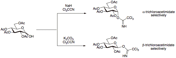 Trichloroacetimidates were first introduced and explored by Schmidt in 1980[22][23] and since then have become very popular for glycoside synthesis. The use of trichloroacetimidates provides many advantages including ease of formation, reactivity and stereochemical outcome.[13]