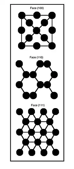 Silicon wafers are cut from a solid ingot of nearly-pure (99.9999999%) silicon. This is done through the process of Czochralski growth, which is diagramed in the adjacent image, and produces a single intact diamond cubic silicon crystal. Due to its structure, monocrystalline silicon is anisotropic, which gives it different structural and electrical properties in different plane directions. Using miller indexes to denote the different plane orientations, the (1,0,0) and the (1,1,1) faces are typically used in silicon wafers (see image). The silicon ingot is oriented and cut along one these planes to expose that surface for processing through photolithography. The reason to use either of these planar faces depends on the application for which the silicon wafer will be used, or how it will be processed. At any rate, this depends on the use of etchants, photoresist, and acids to treat the surface, and the chemical interactions of these chemicals with the crystal surface depends on the surface properties of that crystalline face. A table on the right depicts the surface energies, atomic densities, and interatomic spacing of the three planes for a silicon crystal.[3]
