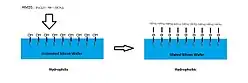 A common method to increase adhesion of photoresist on the silicon wafer surface is to treat the wafer with Hexamethyldisilazane (HMDS). A new silicon wafer has a polar surface and has some adsorbed water on the surface.[10] The wafer can undergo a dehydration bake to remove adsorbed water, and followed by the HMDS treatment also known as the priming stage. HMDS can be dispensed in liquid form onto the wafer using a syringe while the wafer is attached to a vacuum chuck in a spin coater. HMDS can also be applied in gas form in the process known as the vapor prime. The HMDS promotes good photoresist-to-wafer adhesion because it ensures the wafer surface is hydrophobic. After HMDS treatment the silicon surface oxide becomes silated, leaving a non-polar surface.[11] The pristine silicon (100) face has a surface energy value of 56.9 mN/m, which is reduced to a value of 44.1 mN/m after HMDS treatment[12] The molecular formula for hexamethyldisilazane is C6H19NSi2.