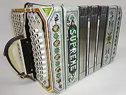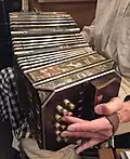 A Chemnitzer concertina is a musical instrument of the hand-held bellows-driven free-reed category, sometimes called squeezeboxes. The Chemnitzer concertina is most closely related to the bandoneón (German spelling: Bandonion), and more distantly, to the other types of concertinas and accordions. It's essentially a bigger version of the Anglo Concertina that sounds more akin to an Accordion due to having Multiple Ranks of Reeds.