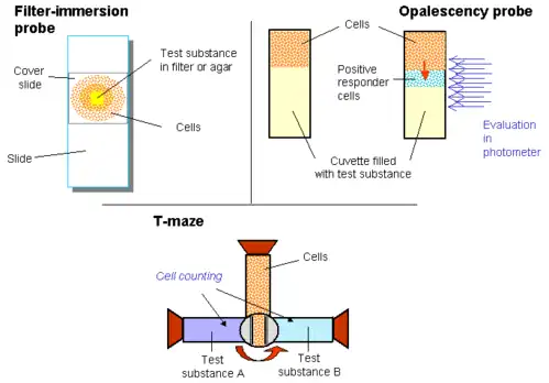 The third frequently used qualitative technique is the T-maze and its adaptations for microplates. In the original version, a container drilled in a peg is filled with cells. Then the peg is twisted and the cells get contact with two other containers filled with different substances. The incubation is stopped by resetting the peg and the cell number is counted from the containers.[8]