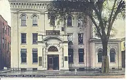 The Chemung County Historical Society is located at 415 East Water Street in Elmira, New York in the former Chemung Canal Bank Building. The society operates two facilities in that building: the Chemung Valley History Museum, located on the first floor, and the Booth Library and archival repository, located on the second floor. From 1834 until 1920, the current museum building served as the Chemung Canal Bank headquarters and then as various offices, notably the Sayles-Evans law office. The building is listed on the National Register of Historic Places. It originally had two and a half stories, and a third story was added in 1868. The building is a brick structure with stepped gables, which is notable, as most of the buildings at the time in Elmira were made of wood. The bank expressed a Greek revival idiom with transitional Federal-style elements. The entrance to the building was a stone stoop with steps adorned with an ornamental wrought iron railing. The building was remodeled in 1903 by the architectural firm Pierce and Bickford when the Chemung Canal Bank merged with the Elmira Trust Company. In December 1920, the Chemung Canal Trust Company moved to a new facility and the Bank building came under the ownership of the Arnot Realty Company.[3]