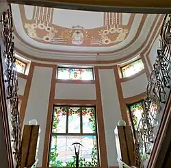 The building has an expressive interior. The lobby of the first floor is decorated with six columns. At the beginning of the grand staircase are two pylons ending with male and female busts on figured pedestals. A wide staircase framed by wrought iron bars with floral and ornithomorphic ornaments leads from the first to the second and third floors. The staircases between the floors are decorated with large stained-glass windows with plant motifs — images of bright flowers and green leaves.