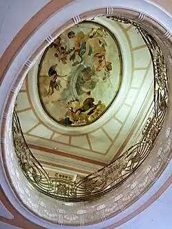 In the center of the second-floor lobby are four columns and a trapezoidal marble fireplace decorated with wrought copper featuring floral ornamentation. The space of the second and third floors is united by an oval opening, decorated with a relief ornament and forged bars, identical to those on the stairs. The contours of this slot are repeated in the oval ceiling of the third floor. This large allegorical composition on canvas with images of female figures and putti is somewhat different from the rest of the decor, stylistically approaching academic art. Its creation is attributed to a Ukrainian artist Mykola Ivasyuk.[9]