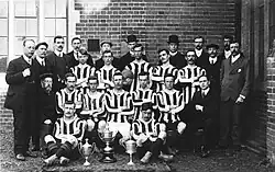 The original Cheshunt Football Club was formed around 1880 and played in black and white stripes.[2] The first recorded game was in 1888, winning 4–0 against Novocastrians. They won the first Herts Charity Cup in 1900–01 and went on to win it again in 1903–04 and 1905–06. They also reached the FA Amateur Cup semi-final in 1903–04, losing 2–0 to Ealing.[3]