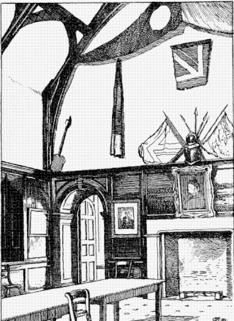 The kitchen was located in the room to the north of the hallway, with a lath and plaster. The adjacent room featured a large, placid-looking fireplace, with the ceiling above supported by three old oak beams supported by a 15-inch-diameter (380 mm) circular pier without capitals in the centre.[6] In 1912 it was reported that one of the piers had been replaced by a simple wooden post.[6] Two windows were located in the east wall, with two openings in the south wall. At the western end was a vaulted passage, which by the early 20th century had been partially bricked up.[6] A fireplace was located in the north wall, with moulded four-centred arch and jambs. The upper floor to the hall was relatively placid, with little of note except for an 18th-century fireplace.[6]