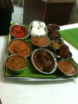 Chettinadu cuisine is the cuisine of a community called the Nattukotai Chettiars, or Nagarathars,[1] from the Chettinad region in Sivaganga district of Tamil Nadu state in India.[2] Chettinad cuisine is perhaps the most renowned fare in the Tamil Nadu repertoire.[3][4][5][6] It uses a variety of spices and the dishes are made with fresh ground masalas. Chettiars also use a variety of sun-dried meats and salted vegetables, reflecting the dry environment of the region. Most of the dishes are eaten with rice and rice based accompaniments such as dosas, appams, idiyappams, adais and idlis. The Chettiars, through their mercantile contacts with Burma, learnt to prepare a type of rice pudding made with sticky red rice.[7] The chefs of manapatti village near Singampunari are experts in cooking Chettinad cuisine. They always used to cook in bulk orders for marriage functions, political functions, etc.[8] though manapatti cooking is portrayed as madurai cuisine because it is located near to madurai district, it comes under chettinad cuisine only and it also comes under the chettinad region of sivagangai district. The entire village people is famous in the art of cooking.