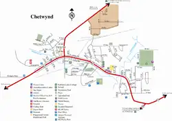 The John Hart Highway portion of Highway 97 runs east–west through Chetwynd, connecting the town to Dawson Creek (102 km [63 mi] east) and Prince George (304 km [189 mi] south). Highway 29 (Don Philips Way) runs north–south through Chetwynd, connecting the town to Hudson's Hope (60 km [37 mi] north) and Tumbler Ridge (89 km [55 mi] southeast). The downtown core lies just west of the intersection of Highway 97 and Highway 29. Chetwynd's internal street network has 28 kilometres (17 mi) of paved road,[42] which uses the highway as its main arterial road with parallel frontage roads for local trips. A site plan by the province in 1957 laid out the basic structure of the town.[5]