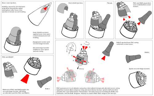 The IFE was built in two primary parts. One warhead was mounted directly to the front of the second stage, as had been the case for all three warheads in the original Polaris. The second part was the "penetration aid carrier", or PAC, which carried the second warhead along with the various penetration aids. The PAC dispensed one RV but the principal purpose of its manoeuvring capability was to dispense the 27 decoys into a 'threat tube' surrounding the RVs, which also had a 'disguise' to match their radar appearance to the decoys. The system was not a MIRVing system because the target of both warheads was one location, about which the two warheads were spread, as in the earlier MRV system of Polaris A3T.