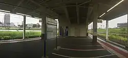 This station consists of one island platform serving two tracks, with an elevated station building located above the tracks and platforms.