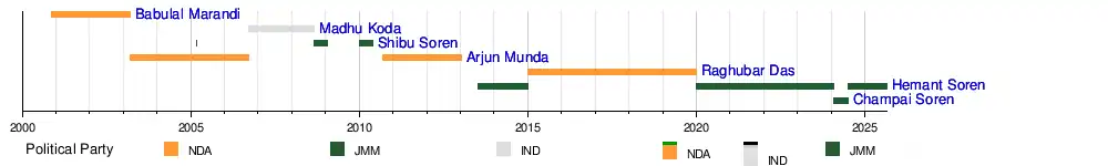 Seven people have served as the state's chief minister since Jharkhand's formation on 15 November 2000.[2] Half of them, including the inaugural officeholder Babulal Marandi and Arjun Munda, represented the Bharatiya Janata Party (BJP). Hemant Soren, from the JMM, is the longest-serving chief minister. Three chief ministers, Shibu Soren, his son Hemant Soren, and Champai Soren, represented the Jharkhand Mukti Morcha (JMM). Shibu Soren's first term ended in just ten days, as he could not prove that he had the support of a majority of the house and was forced to resign. The state has also been governed by Madhu Koda, one of the few independents to become the chief minister of any state.[3] In between their reigns, the state has also been under President's rule three times. Raghubar Das, of the BJP, was the first non-tribal and first chief minister to complete a full term in the state. Hemant Soren of the Jharkhand Mukti Morcha is the incumbent chief minister.