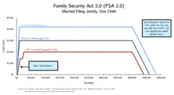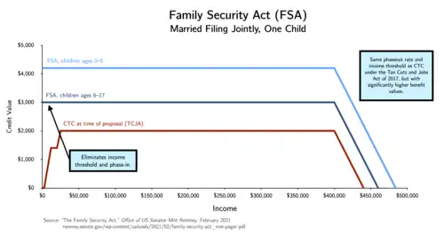 On June 15, 2022, Senator Mitt Romney, along with Senators Richard Burr and Steve Daines, introduced the Family Security Act 2.0 (FSA 2.0), a modification of Romney's earlier plan.[68] Like his earlier plan, the FSA 2.0 would substantially raise the child benefit relative to the existing child tax credit.[69] However, the FSA 2.0 includes a $10,000 income phase-in (i.e. a family must make at least $10,000 to qualify for the full benefit) and retains the substantial reductions to the earned income tax credit from his earlier plan, which would result in many low and moderate income single families seeing their combined benefits cut under the plan.[70]