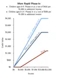 The child tax credit has been criticized for its complexity. In many countries, a simple monthly child allowance is sent to all families.[76] In the United States, by contrast, the CTC has a complicated structure: it includes an income threshold, a phase-in formula, a separate phase-out formula, and mixes reduction of tax liability with direct payments. The 2021 expansion scrapped the income threshold and phase-in, but has a more complicated phase-out structure: it first phases down to a $2,000 plateau and then at higher incomes phases down to $0; the phase-out structure also differs depending on the number of qualifying children (see chart).[59][77]