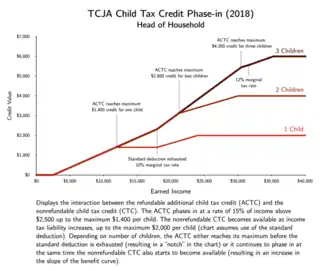 Under the Tax Cuts and Jobs Act of 2017 (TCJA), for the years 2018–2025 (excluding 2021, see below section Temporary Expansion in 2021) the CTC allows taxpayers to reduce their federal tax liabilities by $2,000 per qualifying child (see Eligibility). The maximum credit a taxpayer can receive is thus equal to the number of qualifying children multiplied by $2,000 (e.g. a family with 3 qualifying children is eligible for $2,000 x 3 = $6,000 in tax relief). The credit begins to phase out at a rate of $50 for every $1,000 in additional income over $200,000 for single filers and unmarried heads of households or over $400,000 for married joint filers.[11]