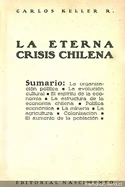 Later, the lawyer and academic Alberto Edwards published La fronda aristocrática en Chile (English: The aristocratic frond in Chile), a book that criticized the gentrification of the Chilean aristocracy due to its lack of connection with reality, its lack of ability to react to crisis and its economic attitude. Edwards criticized liberalism in the book, accusing it of uprooting the nation of its traditions and its founding values. This work was strongly influenced by The Decline of the West by German philosopher Oswald Spengler, who he cited and studied; the investigators Renato Cristi and Carlos Ruize define Edwards as a "conservative-revolutionary" thinker. For his part, fellow academic Carlos Keller, student of Spengler and member of the National Socialist Movement of Chile, published La eterna crisis chilena (English: The eternal Chilean crisis), a book of political economy and sociological analysis that showed what Mario Góngora called “the nationalist response to the crisis”.