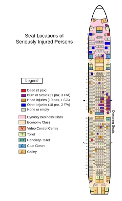 Rescue vehicles quickly arrived on the scene and suppressed the fire on and in the vicinity of the aeroplane, allowing rescue of the passengers and crew to progress in very difficult conditions. Two passengers rescued from the wreckage were certified dead on arrival at hospital and one passenger died five days later in hospital.[10] A total of 219 people, including crewmembers, were admitted to hospital, of whom 50 were seriously injured and 153 sustained minor injuries. All 15 crew members survived.[5]: 7