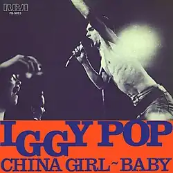 "China Girl" is a song written by Iggy Pop and David Bowie in 1976, and first released by Pop on his debut solo album, The Idiot (1977). Inspired by an affair Pop had with a Vietnamese woman, the lyrics tell a story of unrequited love for the protagonist's Asian girlfriend, realizing by the end that his Western influences are corrupting her. Like the rest of The Idiot, Bowie wrote the music and Pop improvised the lyrics while standing at the microphone. The song was released as a single in May 1977 and failed to chart.
