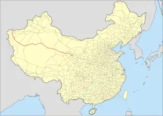Constructed in 1954, the Qinghai-Xinjiang Highway, also known as the China National Highway 315 (G315) runs west from Xining, Qinghai towards Kashgar, Xinjiang. It is 3,063 kilometres (1,903 mi) in length. In 1994 the departments of communication and transportation in Qinghai and Xinjiang began the process of updating the highway.[1][2] In the west it follows the desert Qaidam Basin south of the traditional Silk Road, crosses the Altyn-Tagh into Xinjiang, and then follows the south side of the Tarim Basin to Kashgar.