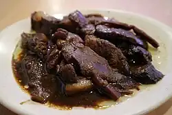 - Haisom cah (炒海參), stir fried trepang with garlic, onion, hioko mushroom, scallion, minced chicken, soy sauce and oyster sauce.