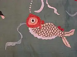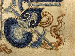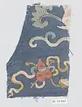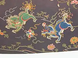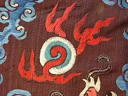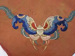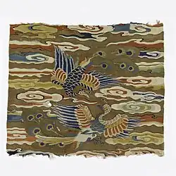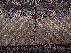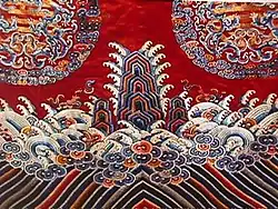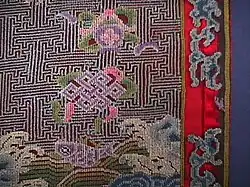 Chinese auspicious ornaments in textile and clothing refers to any form of Chinese auspicious ornaments, which are used to decorate various forms of Chinese textile and clothing (including Hanfu and Qizhuang), fashion accessories, and footwear in China since the ancient times.[1][2] Chinese auspicious ornaments form part of Chinese culture[2] and hold symbolic meanings.[1] In ancient China, auspicious ornaments were often either embroidered or woven into textile and clothing.[1] They are also used on religious and ritual clothing (e.g. Daojiao fushi which is Taoist clothing[3]: 101 and Chinese Buddhist clothing) and in Xifu, Chinese opera costumes.[4] Auspicious symbols and motifs continue to be used in present-day China in industries, such as home textiles and clothing; they are also used in modern design packaging and interior design.[5] Some of these Chinese auspicious ornaments were also adopted by European countries during the era of Chinoiserie, where they became decorative patterns on fashionable chinoiserie fashion and textiles.[6]