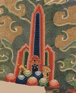 Mountains are also one of the twelve ornaments which are embroidered on the Imperial robes.[12] The rock found in the bottom-centre of the Qing dragon robes, represents the sacred mountain (山, shān), one of the Twelve ornaments.[1]