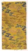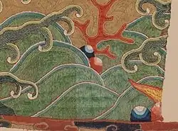 Pearls (baozhu) is symbol of good fortune (wealth); it was used to decorate clothing.[15]: 123 According to Chinese belief, pearls embodied the yin essence of the moon and would protect them from the yang essence of the sun.[15]: 123 Pearls are often depicted with the imperial dragon as according to the legend, the dragon guards a peal under the water.[16]: 132 The pearl is one of the Eight treasures and regularly appears on textiles and rank badge.[15]: 123 By the mid-Qing dynasty, the pearl evolved into the flaming pearl.[15]: 123 The flaming pearl represents the sun, wisdom, power and an imperial treasure.[16]: 132