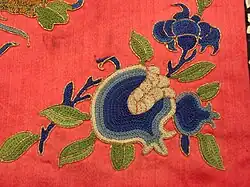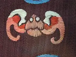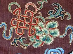 Chinese auspicious patterns and motifs have profound meanings and are rich in forms; these reflect the desires and yearning of the ancient Chinese to pursue a better life.[5] Chinese auspicious ornaments are typically decorations of Chinese cultural origins which are rooted in Confucianism, Taoism, Chinese Buddhism beliefs, in Chinese mythology and cosmology and concepts, as well from Buddhist visual arts and from the natural flora and fauna in China.[1][2] Throughout Chinese history, the use of Chinese embroideries on textile, clothing, and footwear also reflected and expressed the subtle changes in aesthetic concepts, cultural traditions, ethics and morals of the Chinese people throughout the millennia.[7]
