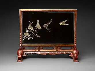 Chinese furniture is usually light, whenever possible, anticipating Europe by several centuries in this respect. Practical fittings in metal such as hinges, lock plates, drawer handles and protective plates at edges or feet are used and often given considerable emphasis, but compared to classic European fine furniture, purely decorative metal mounts were rare. From the Qing dynasty, furniture made for export, mostly to Europe, became a distinct style, generally made in rather different shapes to suit the destination markets and highly decorated in lacquer and other techniques.[2]