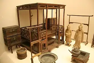 The forms of Chinese furniture evolved along three distinct lineages which date back to 1000 BC:[1] frame and panel, yoke and rack (based on post-and-rail seen in architecture) and bamboo construction techniques. Chinese home furniture evolved independently of Western furniture into many similar forms, including chairs, tables, stools, cupboards, cabinets, beds and sofas. Until about the 10th century CE, the Chinese sat on mats or low platforms using low tables, but then gradually moved to using high tables with chairs.[2]