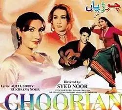 Choorian (Punjabi: چوڑیاں, transl. Bangles) is a 1998 Pakistani Punjabi-language action romantic film, directed by Syed Noor and produced by Haji Faqir Mohammad. The film stars Moammar Rana, Saima, Babar Butt (Pakistani Actor ) and Nargis in leading roles. Choorian is one of Pakistan’s highest-grossing films of all time.[2][3][4]