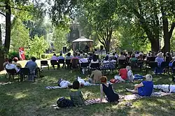 The festival's specific feature is that the audience listens to the music outdoors, on one of the islands in the Castle, scattering freely all across the island, sitting on benches, chairs or lying on mats spread out on the grass. Besides, the music that pianists perform can be heard inside the Castle, namely in the St. Michael's Hall, where concerts of chamber music take place.[3]
