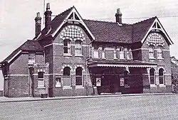 The incongruously large station reflected the large numbers of pupils expected daily, as well as the LB&SCR's hopes of large housing developments.[21][11][3] The main platforms were 800 feet (240 metres) long, whilst those on the Guildford line were 500 feet (150 metres) long, each provided with waiting rooms, large frosted glass canopies and decorative brickwork.[22] The main station building was built in an Italianate style with red and white chequered polychrome brickwork filling heavy cross braced bargeboarded gables and repeated over round-head windows beneath.[23][24] A stone water tower on a brick base formed part of the frontage of the station.[25][26] The main station building was described by Pevsner as "West Sussex's only memorable railway station", "one of the best examples in southern England of an unaltered Late Victorian railway building" and "a better building than the Hospital itself" which combined "a perfect anthology of railway forms."[27] The main building faced a large area intended for cabs, which was reached by an approach road.[14]